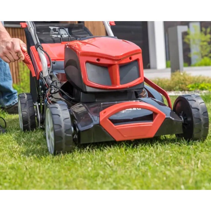 - Колеса (175 мм передні і 210 мм задні) з шарикопідшипниками відмінно пересуваються навіть по нерівній поверхні. Дають можливість легко вести газонокосарку.