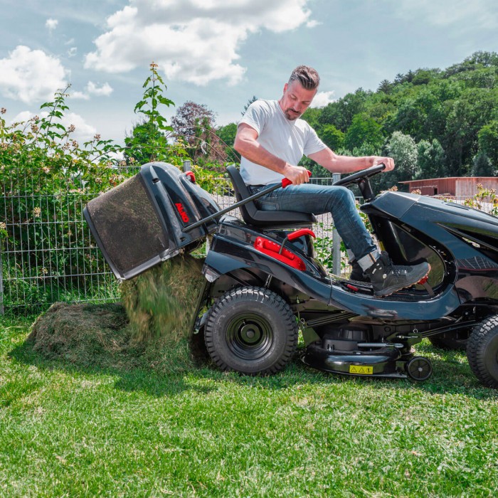 - Травозбірник (220 л) з електроприводом можна легко спустошити з місця водія.