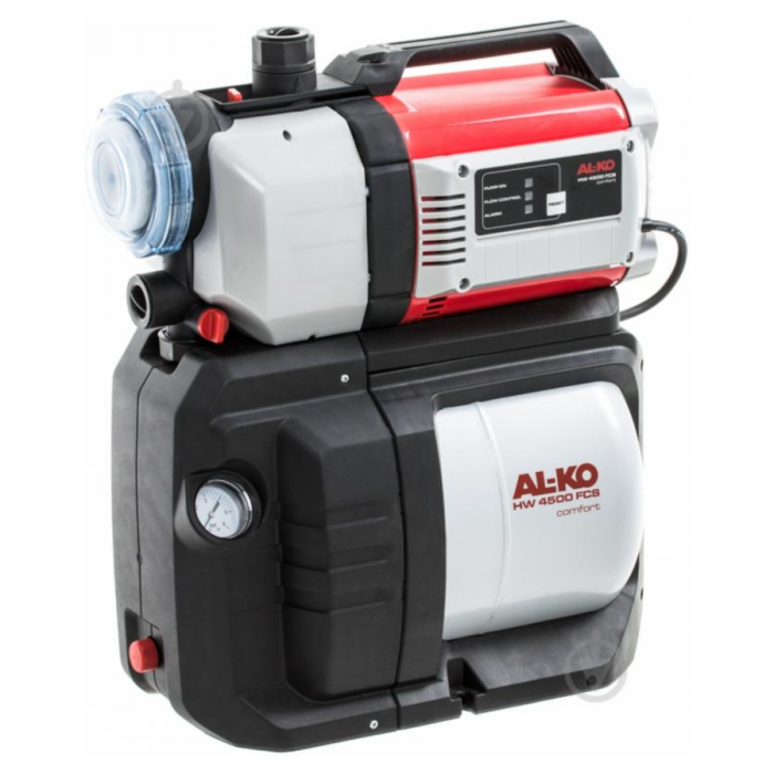 Насосна станція AL-KO HW 4500 FCS Comfort - продуктивне насосне обладнання для організації альтернативної системи водопостачання. Потужний електродвигун дозволяє організувати подачу води з продуктивністю 4500 л/год. Електронна система FCS (Flow Control System) стабілізує тиск потоку води, захищає насос від роботи "всуху", зводить до мінімуму частий запуск помпи, обмежуючи пусковий струм для захисту електроприводу. Автоматичний модуль має зворотний клапан, гаситель гідроударів, манометр, світлодіоди для індикації робочих режимів. Наявність попереднього XXL-фільтра із прозорою скляною кришкою рятує внутрішні частини насосного обладнання від засмічення.
