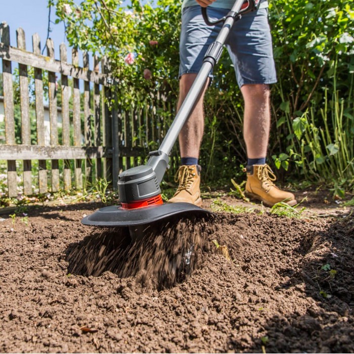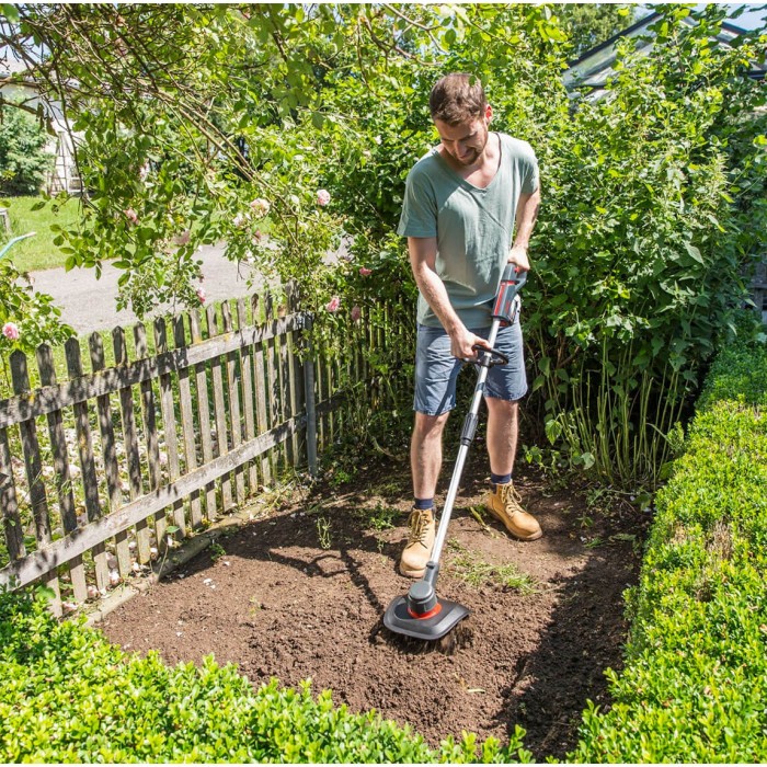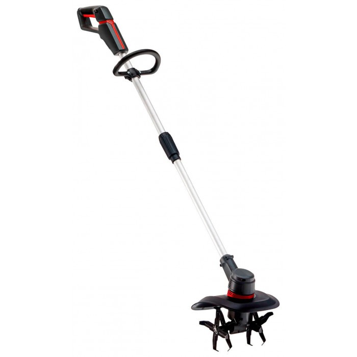 - Культиватор приводиться в дію 18-вольтовою літій-іонною батареєю, яка забезпечує достатню потужність для роботи на невеликих і середніх садових ділянках. Акумулятор є знімним і може бути заряджений за допомогою зарядного пристрою.