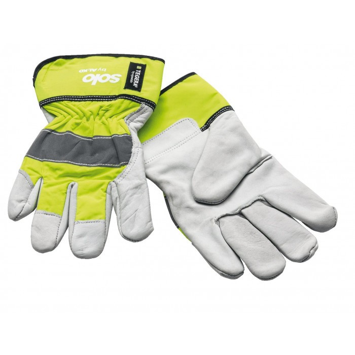 Захисні рукавички solo by AL-KO - Міцна внутрішня поверхня з коров'ячої шкіри, посилені частини вказівного пальця, зовнішня поверхня зі світловідбивним та волого, брудонепроникним матеріалом, гарантують високий рівень комфорту та безпеки.